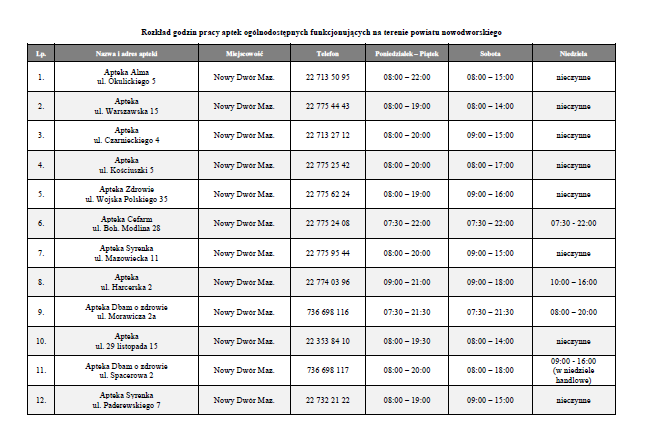 Na podstawie uchwały Rady Powiatu Nowodworskiego z dnia 15 listopada 2018 r. przekazujemy informację odnośnie godzin pracy aptek ogólnodostępnych funkcjonujących na terenie powiatu nowodworskiego [plik doc. do pobrania].