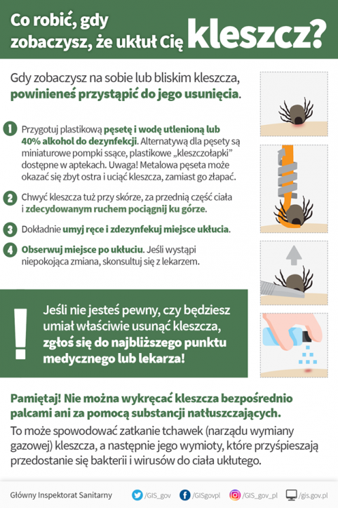 Jeśli jednak, pomimo podjętych przez nas środków ostrożności, kleszcz się do nas przyczepi nie można, w celu jego usunięcia, smarować go tłuszczem czy przypalać. Najlepiej chwycić go plastikową pęsetką i wykręcić w przeciwna stronę do ruchu wskazówek zegara.