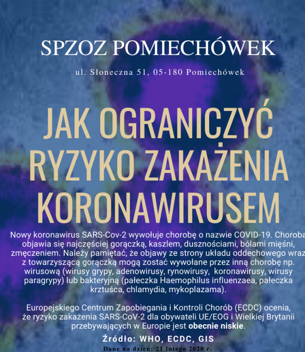 Koronawirus SARS-Cov-2 wywyołuję chorobę o nazwie COVID-19 i przenosi się drogą kropelkową, a więc podczas kaszlu, kichania lub mówienia. Choroba ta najczęściej objawia się gorączką, kaszlem, dusznościami, bólami mięśni lub zmęczeniem. Należy pamiętać, że w/w objawy ze strony układu oddechowego wraz z towarzyszącą gorączką mogą zostać wywołane przez inną chorobę wirusową (wirus grypy, adenowirusy, rynowirusy, wirusy paragrypy) lub bakteryjną (pałeczka Haemophilus influenzaea, pałeczka krztuśca, chlamydia, mykoplazama).