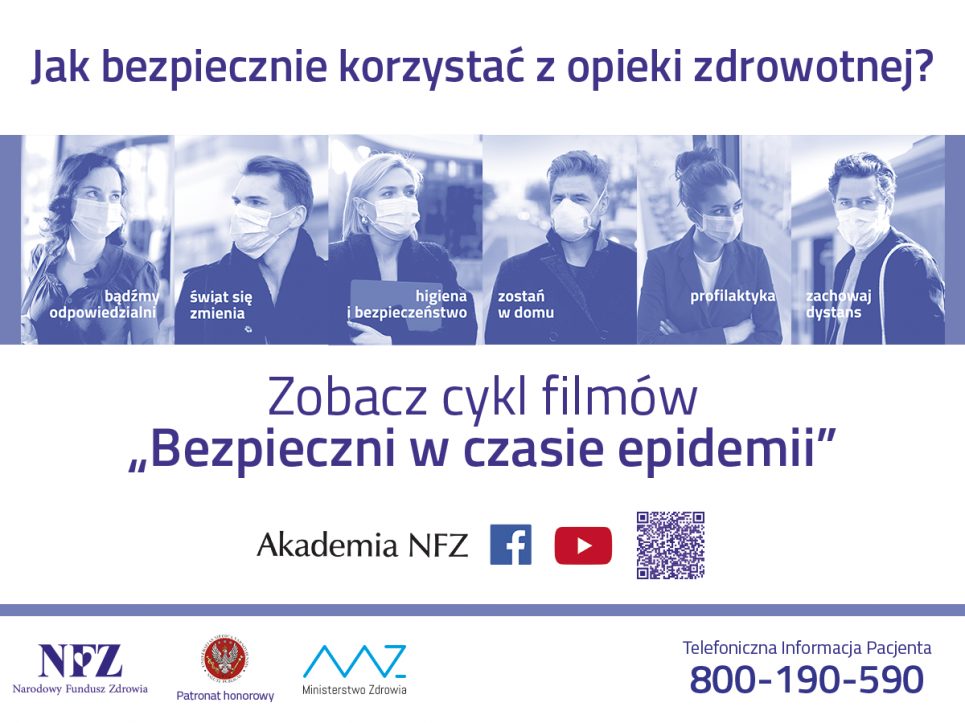 Narodowy Fundusz Zdrowia pod patronatem Ministerstwa Zdrowia oraz Warszawskiego Uniwersytetu Medycznego przygotował cykl 10 filmów edukacyjnych pod wspólnym tytułem „Bezpieczni w czasie epidemii”, które podpowiadą, jak bezpiecznie żyć w czasie COVID-19. Więcej informacji można uzyskać pod numer infolinii 800 190 590 oraz na kanale Akademii NFZ - na YouTube (link do strony).